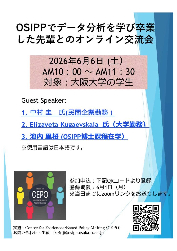 この度、CEPOは、学生の皆さんの進路選択の一助となるように、OSIPPでデータ分析の手法を学び、実社会で活躍されている様々な先輩方とのzoomでの交流会を開きたいと思います。ご興味のある方はふるってご参加ください。
